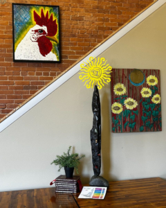 We continue to serve as a community based art gallery and love the sea creatures that are adorning our walls this Summer by Joann Seddon. Please feel free to stop by for a self guided tour or reach out if you’d like to schedule a meeting with Joann regarding purchasing any of her art or commissioning a piece. She is currently busy managing her busy flower and vegetable farm and chickens in Charlestown at