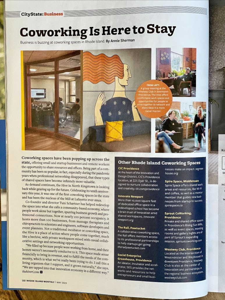 Picture above is of a feature in this month’s RI Monthly about coworking! Thank you to the amazing local journalist, Annie Sherman, for sharing our story!