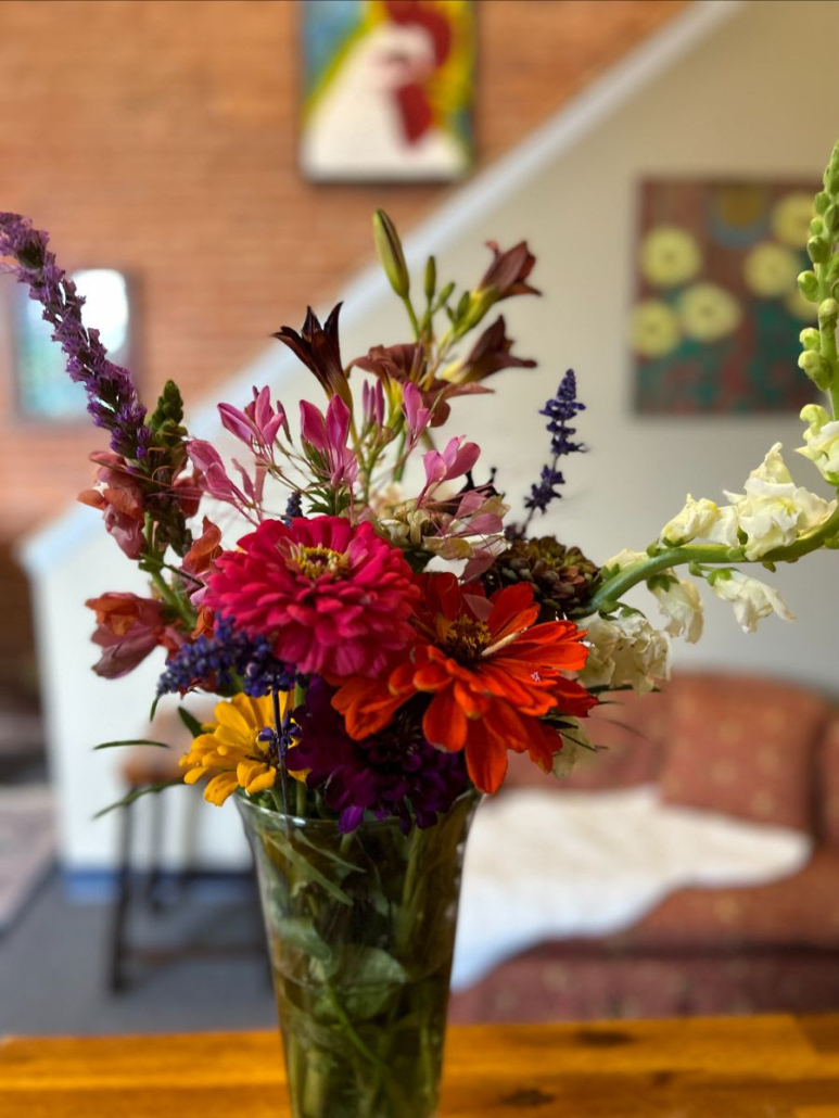 Pictured above: Fresh flowers from one of our resident artists & favorite farmers, Joann Seddon of Cluckingham Palace!